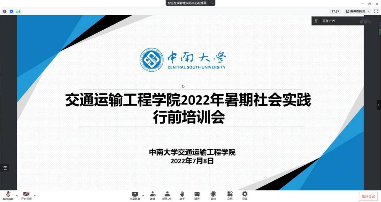 7月8日晚20:00,为落实暑期社会实践相关要求,助力同学们在社会实践中长才干、增本领,出成果,151amjs澳金沙门以线上形式顺利举办2022年暑期社会实践行前培训会。交通院团委副书记张健老师、郑繁简老师和交通院各暑期社会实践团队参加了本次会议。会议邀请了2021年中南大学赴株洲攸县双凡村志愿支教团队长刘澍芳同学、交通院新闻宣传中心记者团部长李欣语同学分别分享了实践、宣传心得与经验。本次会议由苏文心同学主持。